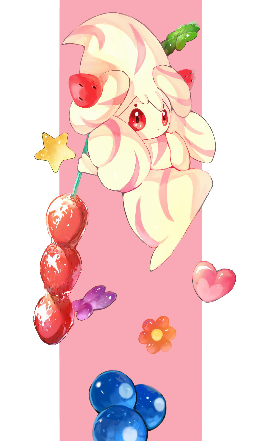 1girl alcremie alcremie_(strawberry_sweet) alcremie_(vanilla_cream) big_hair blueberry bug butterfly closed_mouth clover colored_skin expressionless female_focus flower food four-leaf_clover fruit full_body gen_8_pokemon hands_up heart heart_in_eye highres holding holding_food horezai insect long_hair looking_at_viewer multicolored_hair multicolored_skin nintendo orange_flower pink_background pink_hair pink_skin pokemon pokemon_(creature) red_eyes simple_background solo star_(symbol) strawberry streaked_hair symbol_in_eye two-tone_hair two-tone_skin white_hair white_skin