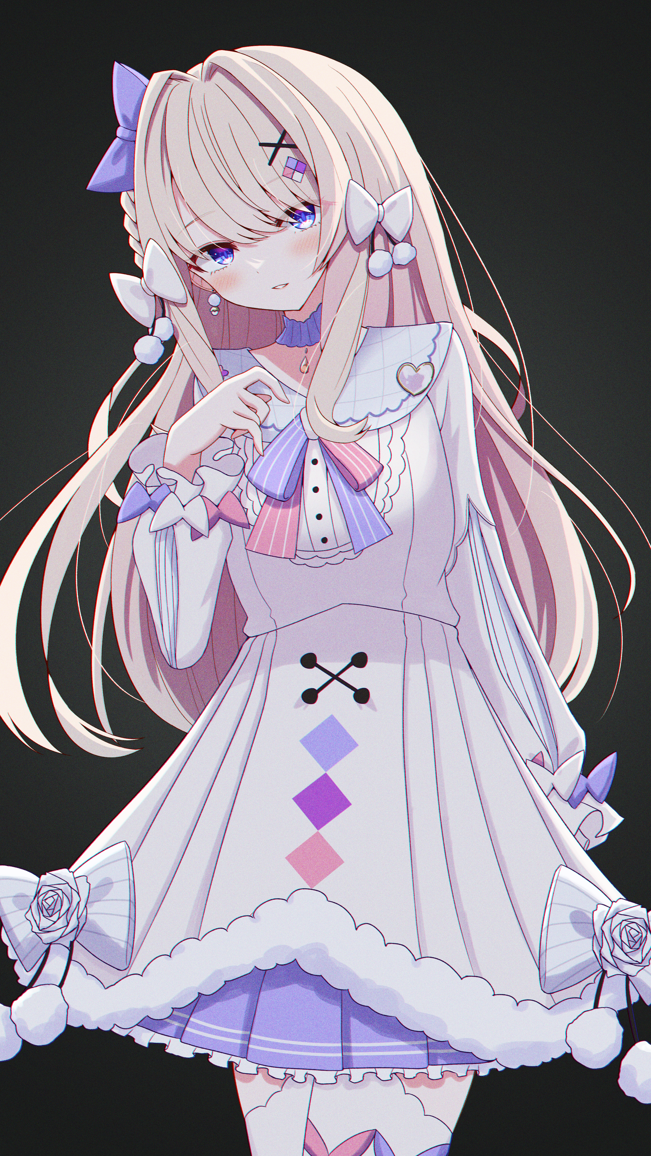 1girl absurdres black_background blue_bow blue_eyes bow braid brooch choker coat_dress darkness dress hair_between_eyes hair_bow hair_intakes heart heart_brooch herumu_(kouzome_mia) highres indie_virtual_youtuber jewelry light_brown_hair long_hair long_sleeves pom_pom_(clothes) ribbon simple_background sleeves_past_wrists solo thighhighs virtual_youtuber watagashi_unou white_bow white_thighhighs