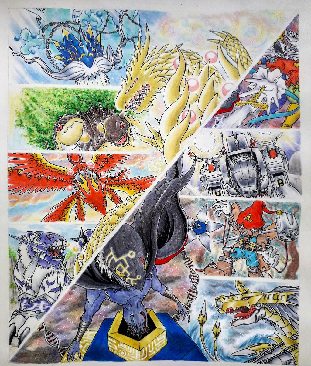 apocalymon baihumon bird digimon dragon highres huanglongmon metalseadramon mugendramon piemon pierrot pinochimon puppet qinglongmon tail tiger turtle xuanwumon zhuqiaomon