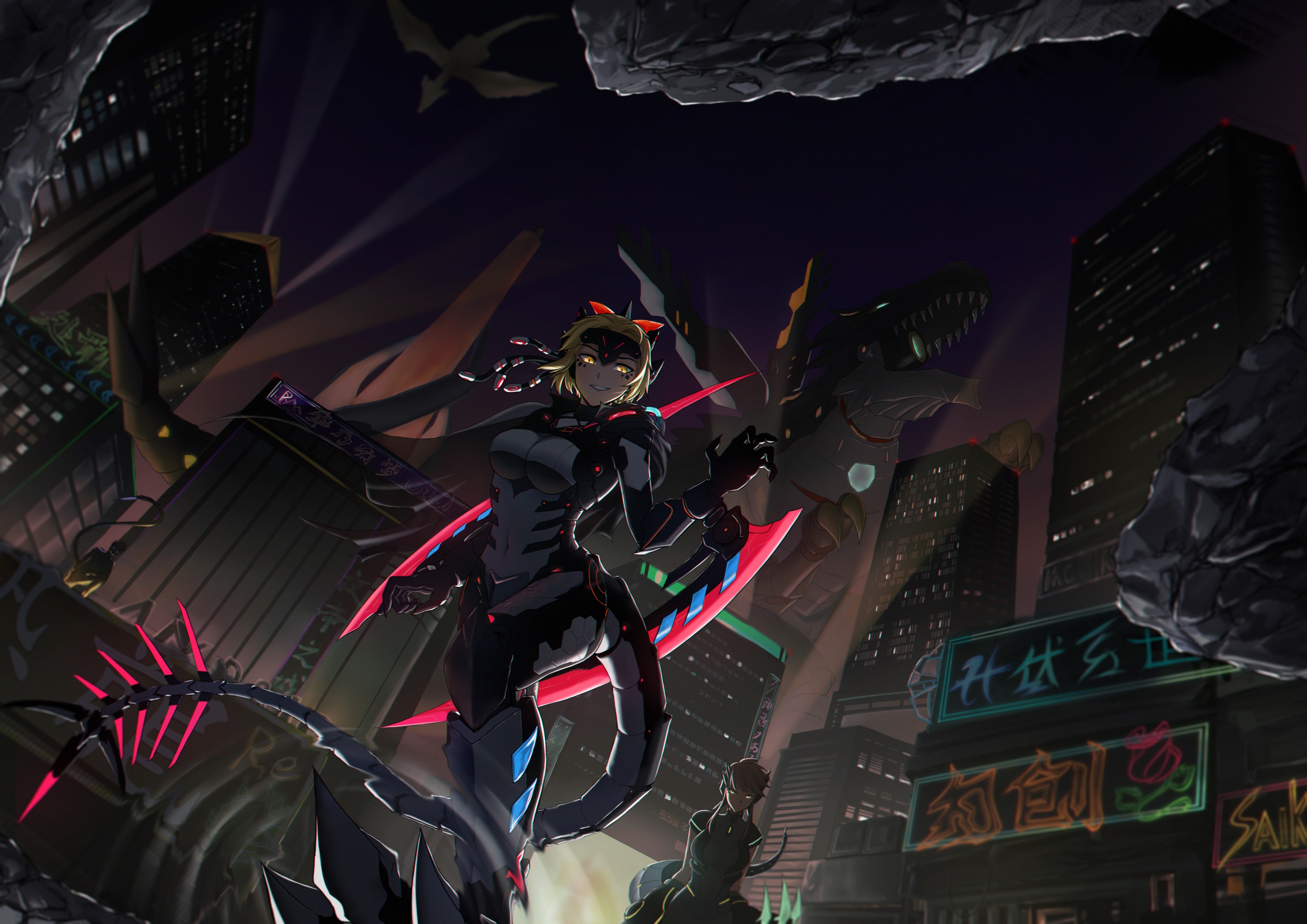 2girls absurdres arm_blade blonde_hair bodysuit breasts brown_hair building chinese_commentary city dinomorphia_diplos dinomorphia_kentregina dinomorphia_therizia dinosaur duel_monster feet_out_of_frame full_body gauntlets glowing glowing_eyes headband highres large_breasts long_hair mechanical_tail multiple_girls neon_lights outdoors saikre searchlight short_hair_with_long_locks short_sleeves silhouette standing tail teeth weapon yellow_eyes yu-gi-oh!