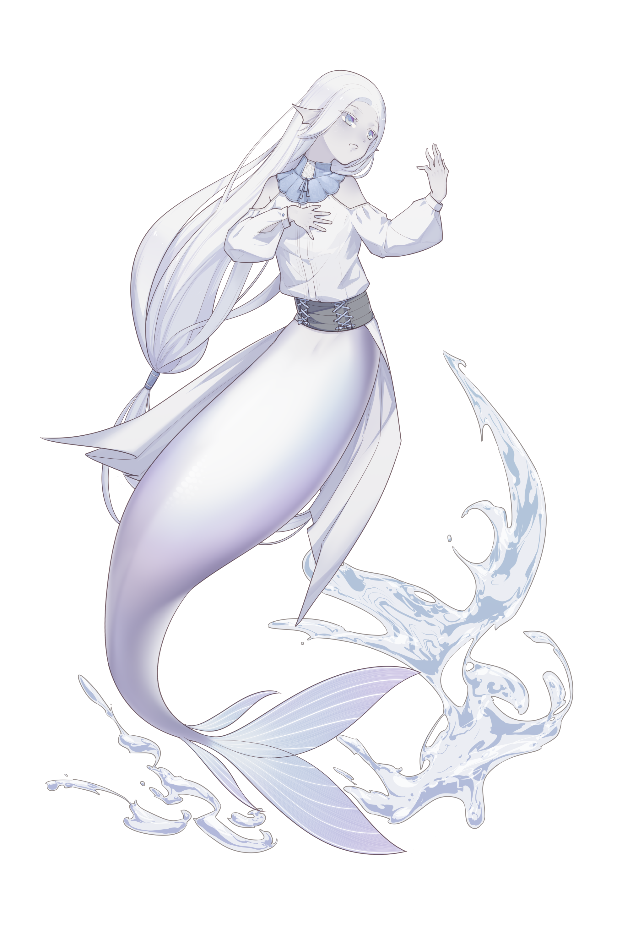 1boy absurdres albino androgynous bare_shoulders blue_eyes clothing_cutout colored_eyelashes colored_skin fins full_body hand_on_own_chest hands_up highres kinerv liquid long_hair long_sleeves looking_to_the_side low-tied_long_hair male_focus merfolk merman monster_boy open_mouth original puffy_long_sleeves puffy_sleeves shoulder_cutout simple_background solo very_long_hair water white_background white_hair white_skin