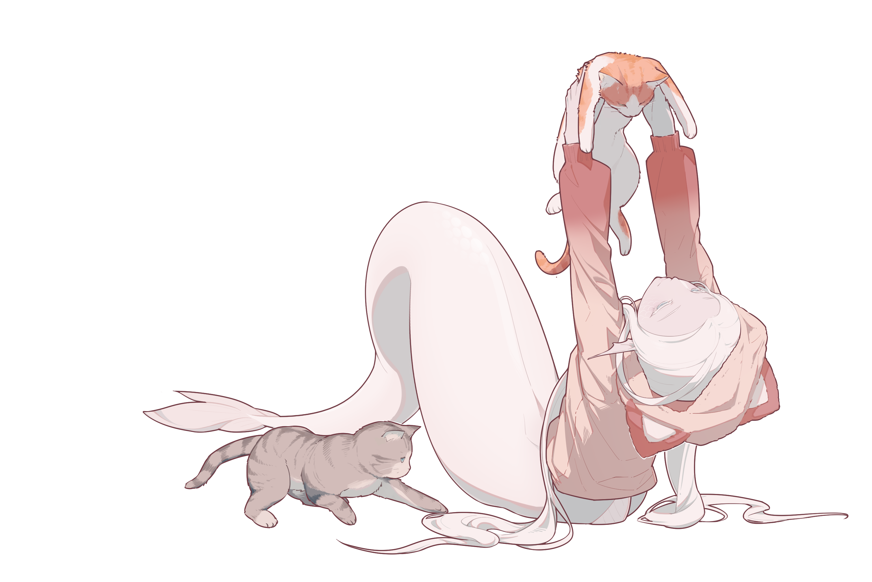 1boy albino androgynous animal animal_ears animal_hood blue_eyes cat colored_eyelashes colored_skin fake_animal_ears fins full_body head_fins highres holding holding_animal hood hood_up hoodie kinerv light_smile long_hair looking_at_animal looking_up male_focus merfolk merman monster_boy original pink_hoodie scales simple_background sitting solo very_long_hair white_background white_hair white_scales white_skin