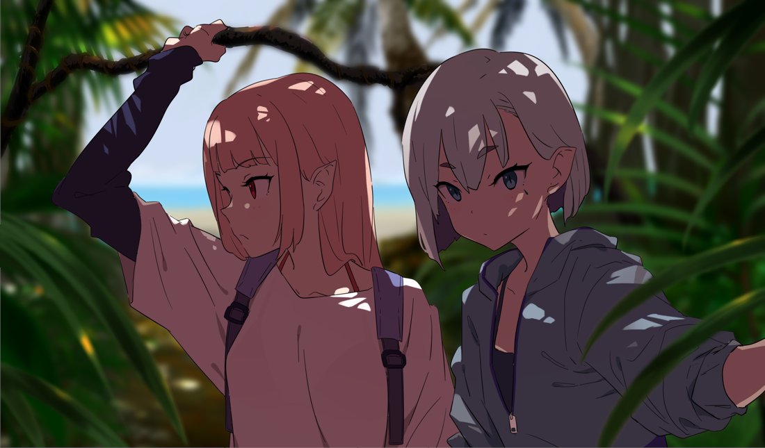 2girls backpack bag blue_jacket blurry blurry_background branch cei_(sohin) facial_mark forest grey_hair jacket long_hair looking_at_viewer mee_(sohin) multiple_girls nature original outdoors palm_tree pointy_ears red_eyes shade shirt short_hair sleeves_rolled_up slit_pupils sohin teardrop_facial_mark tree upper_body white_shirt