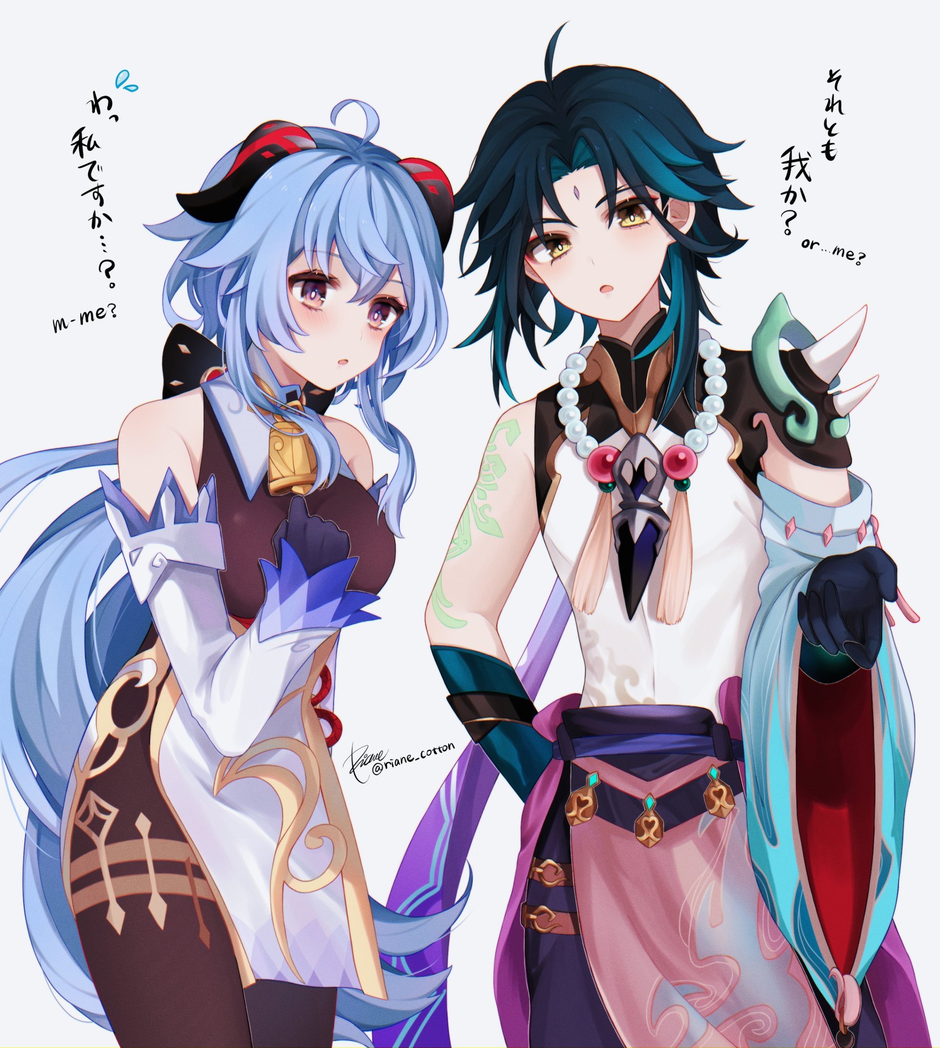 1boy 1girl :o ahoge aqua_hair arm_tattoo artist_name bead_necklace beads bell black_bodysuit black_gloves blue_gloves blue_hair blue_pants bodice bodysuit chinese_clothes cowbell cowboy_shot detached_sleeves eyelashes eyeshadow facial_mark forehead_mark ganyu_(genshin_impact) genshin_impact gloves goat_horns gold_trim green_hair hand_up highres horns jewelry long_hair looking_at_viewer looking_back low_ponytail makeup multicolored_hair neck_bell necklace pants parted_bangs parted_lips pelvic_curtain ponytail purple_eyes red_horns riane_cotton shirt short_hair shoulder_pads shoulder_spikes single_detached_sleeve single_shoulder_pad sleeveless sleeveless_shirt spikes standing streaked_hair tattoo translation_request twitter_username very_long_hair white_background white_shirt white_sleeves wide_sleeves xiao_(genshin_impact) yellow_eyes