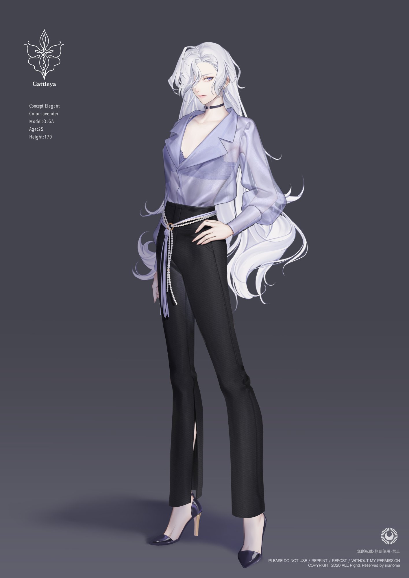 1girl black_choker black_gem blue_bra blue_eyes blue_footwear blue_gem bra choker closed_mouth collarbone earrings english_text fingernails full_body gem grey_background grey_hair hair_over_one_eye hand_on_own_hip high_heels highres inanome_me jewelry long_fingernails long_hair nail_polish o-ring original pearl_(gemstone) pink_lips pink_nails see-through_clothes sharp_fingernails signature simple_background single_earring solo standing stats underwear very_long_fingernails very_long_hair
