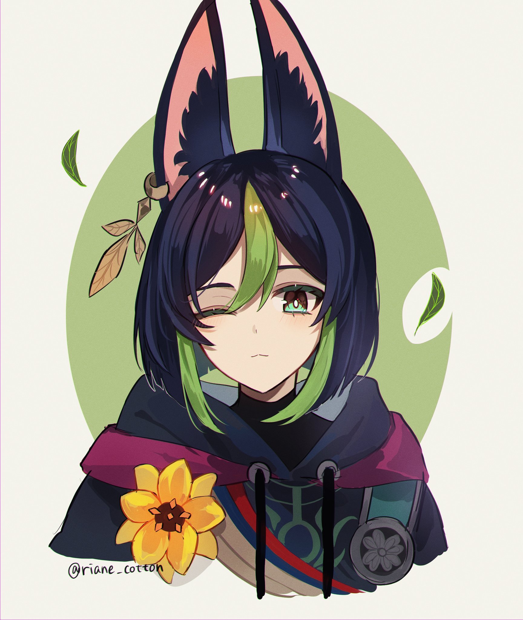 1boy animal_ear_fluff animal_ears artist_name black_hair blunt_ends blush closed_mouth cropped_torso drawstring earrings falling_leaves flower fox_ears genshin_impact green_eyes green_hair hair_between_eyes highres hood hood_down hoodie jewelry leaf looking_at_viewer male_focus medal multicolored_hair one_eye_closed riane_cotton short_hair sidelocks simple_background single_earring solo streaked_hair tighnari_(genshin_impact) turtleneck twitter_username two-tone_hair upper_body yellow_flower