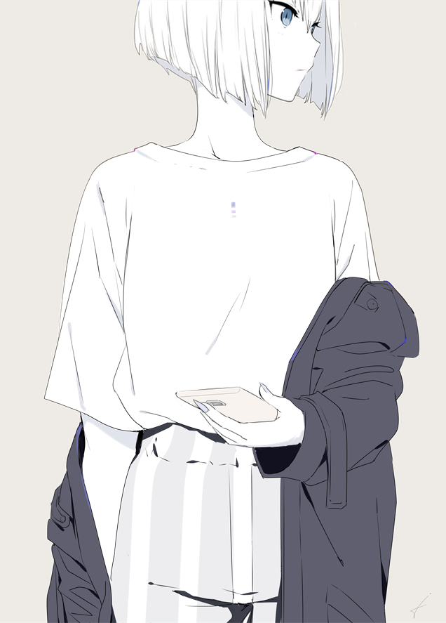 1girl blue_eyes cellphone closed_mouth clothes_down coat greyscale holding holding_phone long_sleeves looking_to_the_side mee_(sohin) monochrome original pants phone shirt shirt_tucked_in short_hair sohin solo spot_color standing upper_body