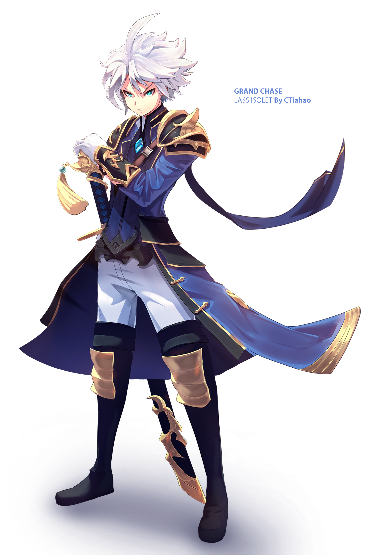 1boy ahoge aqua_hair arm_guards armor belt black_boots blue_coat blue_shirt boots brown_belt character_name coat copyright_name ctiahao full_body gloves gold_trim grand_chase hair_between_eyes hand_on_hilt high_collar highres holding holding_sword holding_weapon lass_(grand_chase) legs_apart male_focus pants poleyn serious sheath sheathed shirt short_hair shoulder_armor shoulder_belt simple_background solo standing sword tassel thigh_boots weapon white_background white_gloves white_hair white_pants