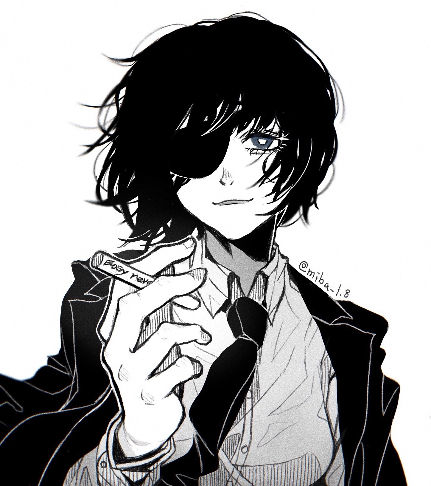 1girl blue_eyes bright_pupils chainsaw_man cigarette closed_mouth eyelashes eyepatch formal_clothes greyscale hatching_(texture) highres himeno_(chainsaw_man) holding holding_cigarette long_eyelashes miba monochrome necktie short_hair simple_background smile solo spot_color suit twitter_username upper_body white_background white_pupils