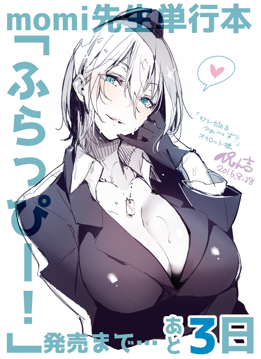 1girl blazer blue_eyes breasts character_request cleavage collarbone collared_shirt commentary_request copyright_request cropped_torso dated dog_tags grin hair_between_eyes half-closed_eyes hand_on_own_chest hand_up hat head_tilt heart highres huge_breasts jacket lips long_sleeves looking_at_viewer military_hat open_mouth parted_bangs parted_lips partially_colored pyon-kichi shiny_clothes shirt short_hair signature simple_background sketch smile solo speech_bubble spoken_heart sweat translation_request upper_body white_background wing_collar