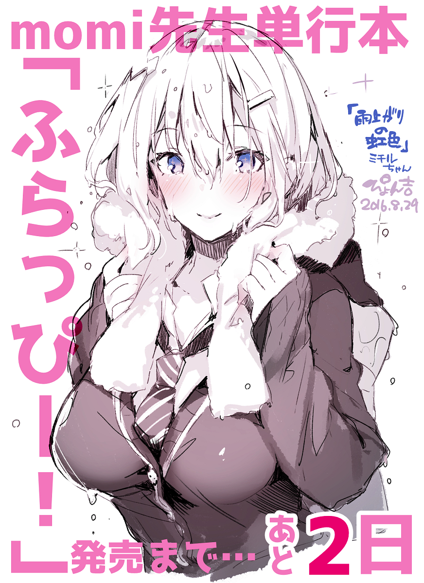 1girl blue_eyes blush breasts character_request closed_mouth collarbone collared_shirt commentary_request copyright_request cropped_torso dated diagonal-striped_clothes diagonal-striped_necktie hair_between_eyes hair_ornament hairclip hands_up highres holding holding_towel large_breasts long_sleeves looking_at_viewer necktie parted_bangs partially_colored pyon-kichi raised_eyebrows shirt short_hair signature simple_background sketch smile solo striped_clothes striped_necktie towel towel_around_neck translation_request upper_body white_background wing_collar
