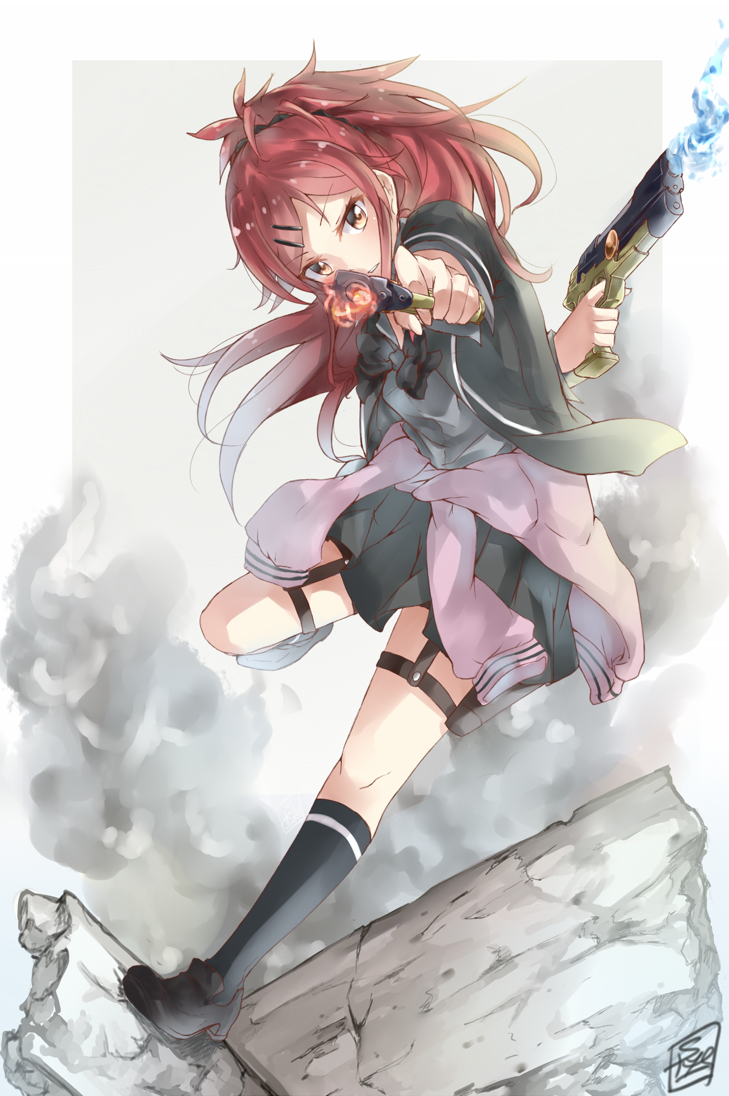 1girl aiming aiming_at_viewer arm_behind_back black_bow black_scrunchie black_skirt black_socks blue_fire border bow brown_eyes chigusa_asuha clothes_around_waist crack dual_wielding dust dust_cloud fire fire gun hair_ornament hairclip handgun highres holding holding_gun holding_weapon holster leg_up limitless_skye long_hair parted_lips aiming ponytail qualidea_code red_hair rock scrunchie signature skirt socks solo thigh_strap weapon white_border