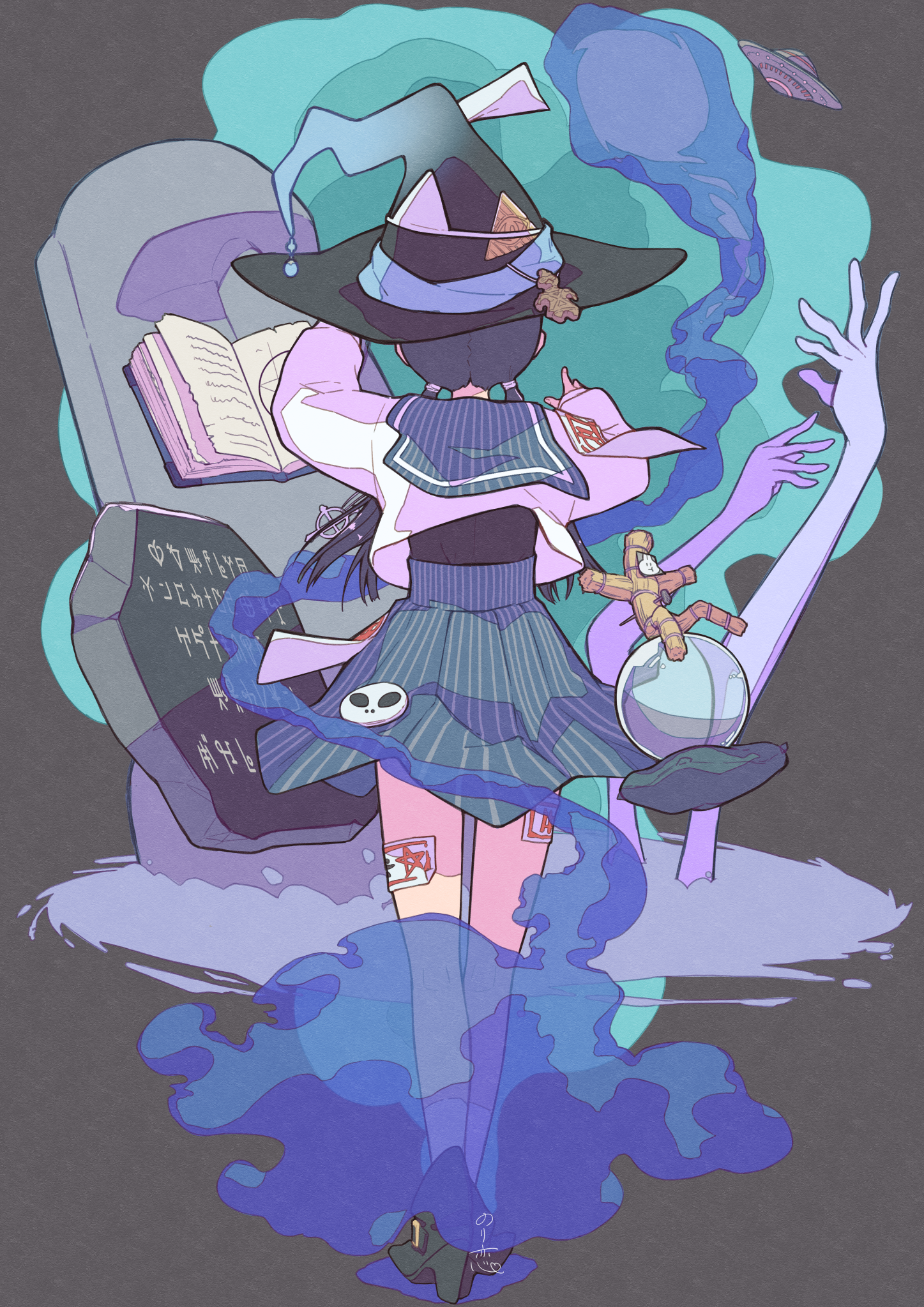 1girl ball black_hair black_hat black_shirt black_shoes blue_ribbon blue_sailor_collar blue_skirt book colored_smoke commentary_request crystal_ball facing_away from_behind full_body grey_background hands_up hat hat_ribbon high-waist_skirt highres ligne_claire long_hair long_sleeves moai norikoi ofuda ofuda_on_clothes open_book original parted_hair pinstripe_pattern pinstripe_skirt pleated_skirt ribbon runes sailor_collar school_uniform shirt shoes signature skirt smoke solo standing straw_doll striped translation_request triangular_headpiece twintails ufo white_shirt witch_hat