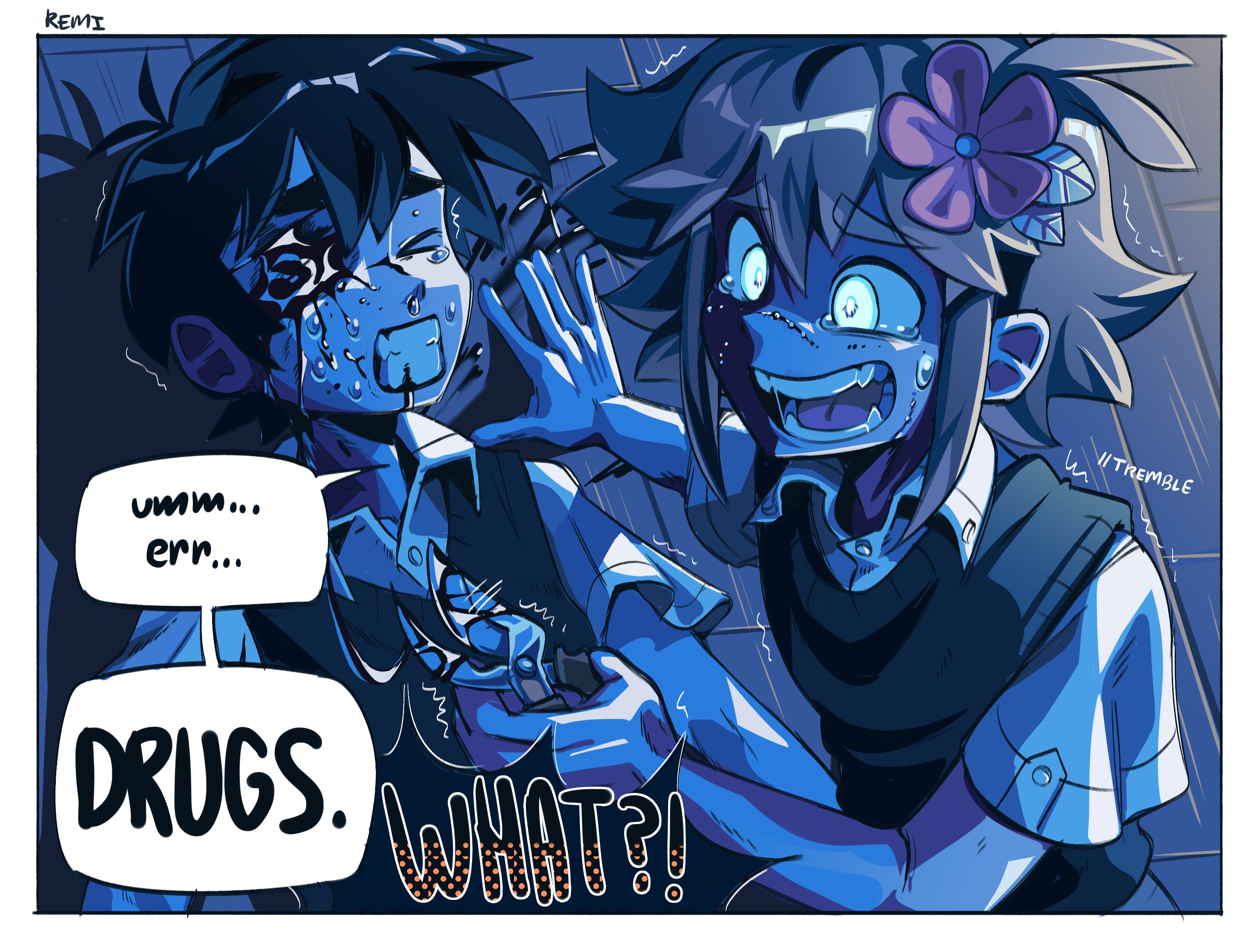 2boys basil_(faraway)_(omori) basil_(omori) black_hair blonde_hair blood blue_eyes collared_shirt crazy english_text flower glowing glowing_eyes guro hair_flower hair_ornament highres indoors multiple_boys omori open_mouth parted_lips remi_(mozzaremi) scar scar_on_face shirt short_hair short_sleeves speech_bubble spoilers sunny_(omori) teeth white_shirt