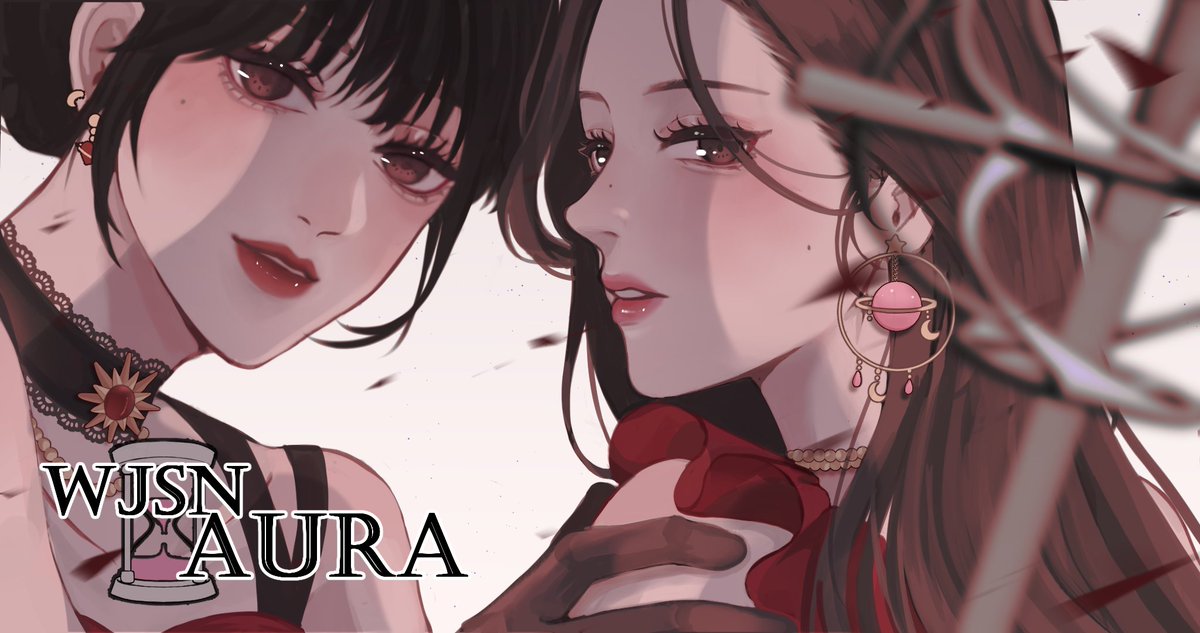 animification black_gloves black_hair bona_(wjsn) brown_hair commentary copyright_name earrings english_commentary gloves hand_on_another's_arm head_tilt jewelry k-pop long_hair looking_at_viewer mole mole_under_eye parted_lips real_life seola_(wjsn) song_name sson_(51db_) white_background wjsn