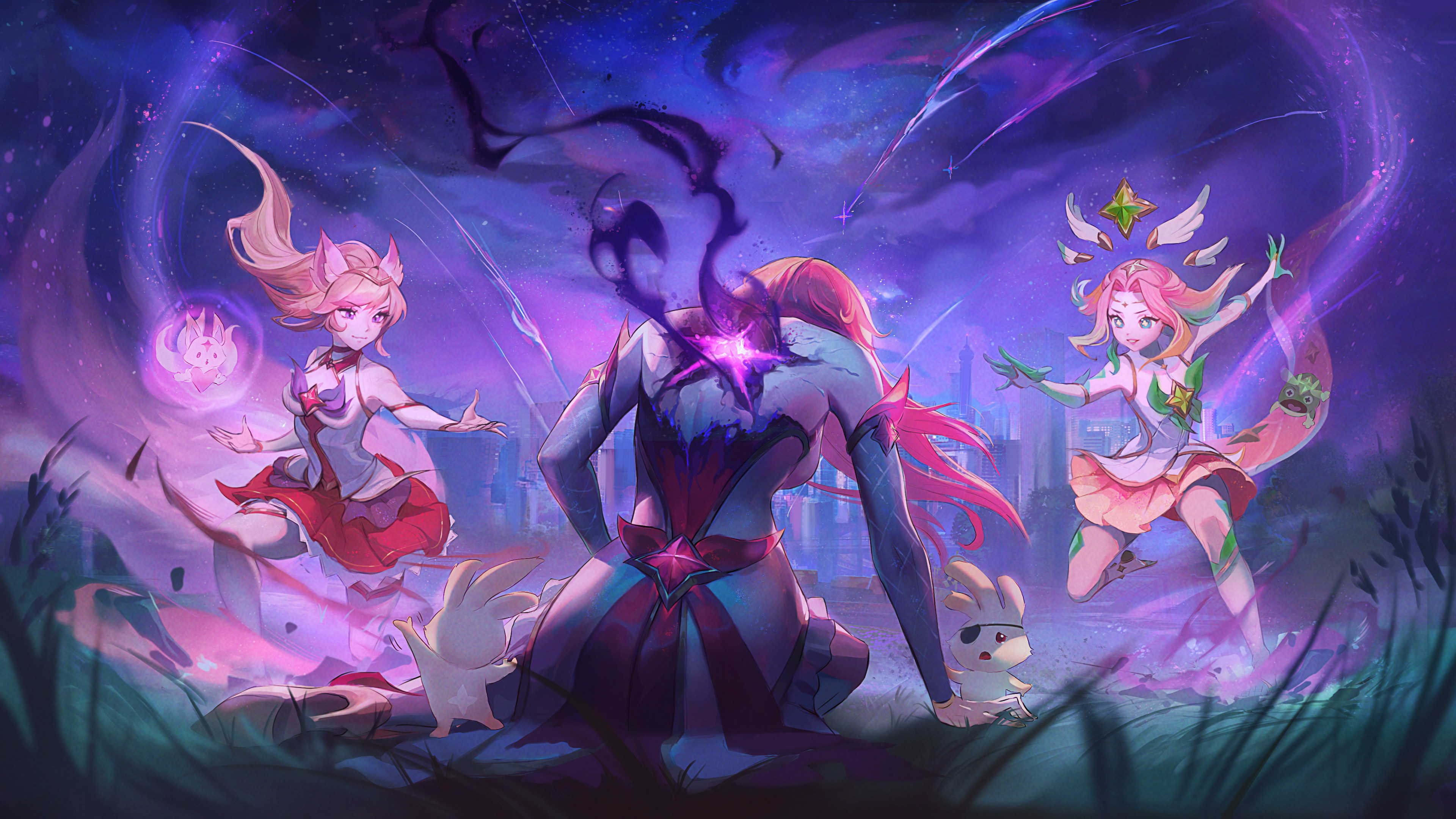 3girls :o absurdres ahri_(league_of_legends) animal_ears bare_shoulders bow bowtie breasts brown_skirt city detached_sleeves eyepatch floating fox_ears fox_girl fox_tail from_behind gem grass green_bow green_bowtie heart high_heels highres large_breasts league_of_legends long_hair magic miniskirt miss_fortune_(league_of_legends) multiple_girls multiple_tails neeko_(league_of_legends) night official_alternate_costume outdoors pink_eyes pink_hair red_hair red_skirt sitting skirt smile standing standing_on_one_leg star_(symbol) star_guardian_(league_of_legends) star_guardian_ahri star_guardian_miss_fortune star_guardian_neeko tail zoe_(crownsforkings)