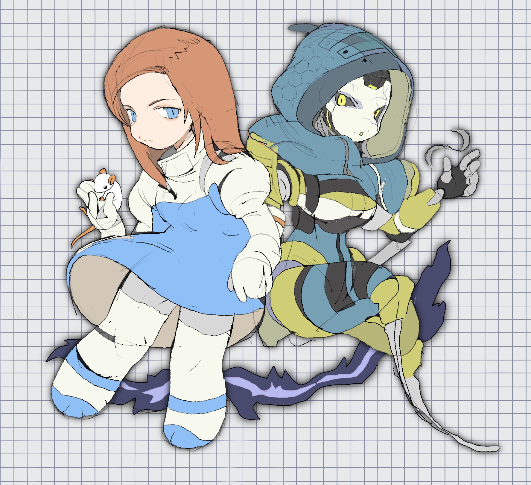 2girls android animal animification apex_legends ash_(titanfall_2) ashleigh_reid black_sclera blue_eyes blue_leotard chibi colored_sclera dual_persona elbow_gloves gloves highres holding holding_animal hood hood_up hooded_leotard kagaya_(oshiriudon) leotard mouse_(animal) multiple_girls open_hand orange_hair puffy_short_sleeves puffy_sleeves short_sleeves simulacrum_(titanfall) white_gloves yellow_eyes