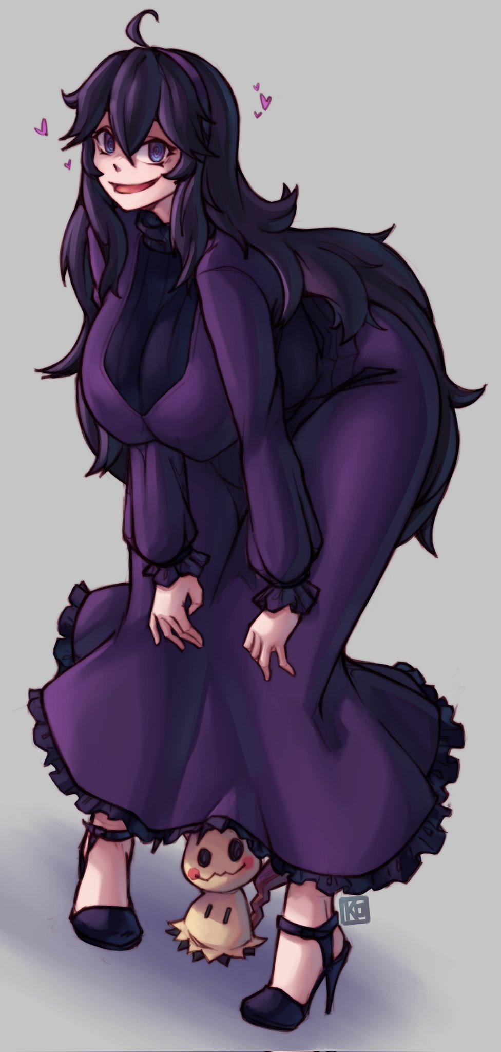 1girl alternate_breast_size_(larger) breasts gen_7_pokemon hex_maniac_(pokemon) hex_maniac_(pokemon_xy) high_heels highres kuroi_oni large_breasts messy_hair mimikyu nintendo pokemon pokemon_x_and_y shaded_face solo