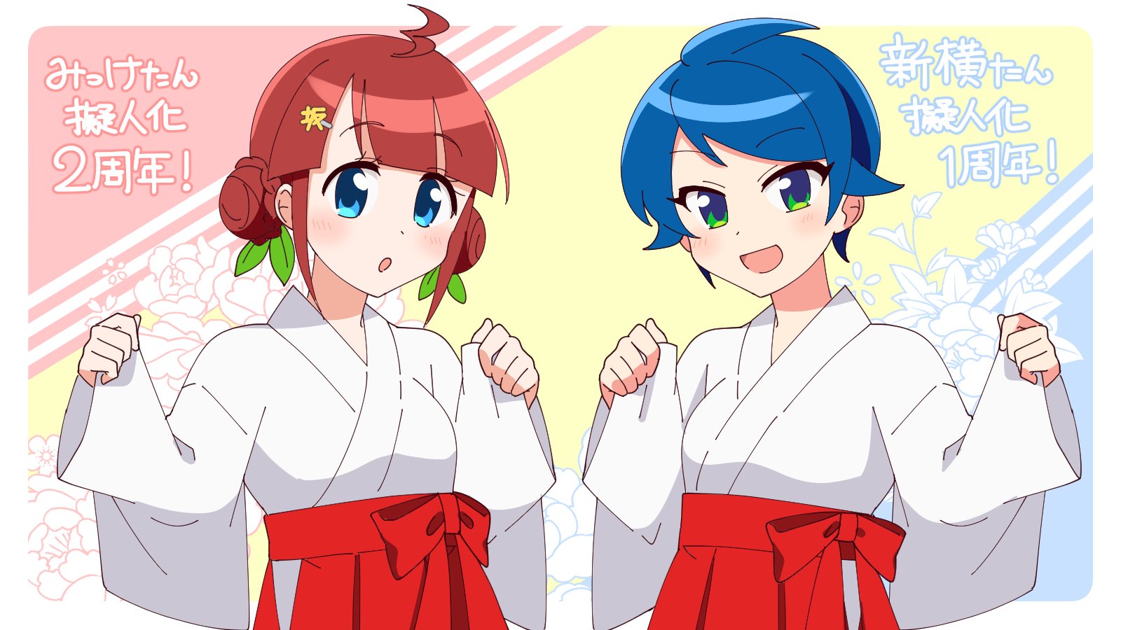 2girls blue_hair highres japanese_clothes mikke-tan miko multiple_girls red_hair shinyoko-tan
