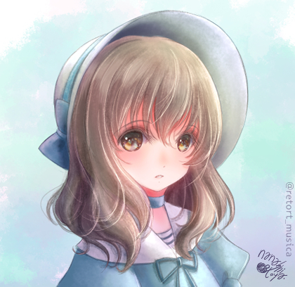 1girl blush bonnet brown_eyes brown_hair choker hat hat_ribbon long_hair looking_at_viewer lowres neck_ribbon original parted_lips ribbon sailor_collar signature sirius. solo twitter_username