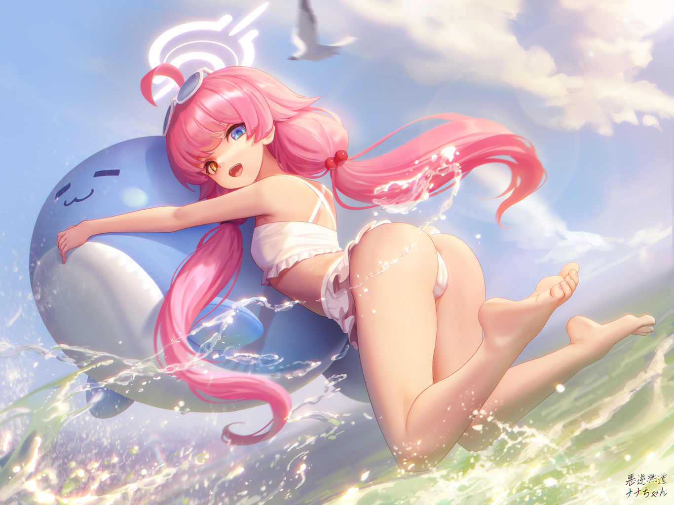 1girl :d ahoge animal artist_name ass bare_arms bare_legs bare_shoulders barefoot beach bikini bikini_skirt bird blue_archive blue_eyes blue_sky blush breasts cloud cloudy_sky dated day eyewear_on_head feet frilled_bikini frills hair_bobbles hair_ornament halo heterochromia horizon hoshino_(blue_archive) hoshino_(swimsuit)_(blue_archive) long_hair looking_at_viewer low_twintails ocean official_alternate_costume open_mouth outdoors paid_reward_available pink_hair sarena seagull sky small_breasts smile soles splashing sunglasses swimsuit toes twintails very_long_hair water waves white_bikini yellow_eyes