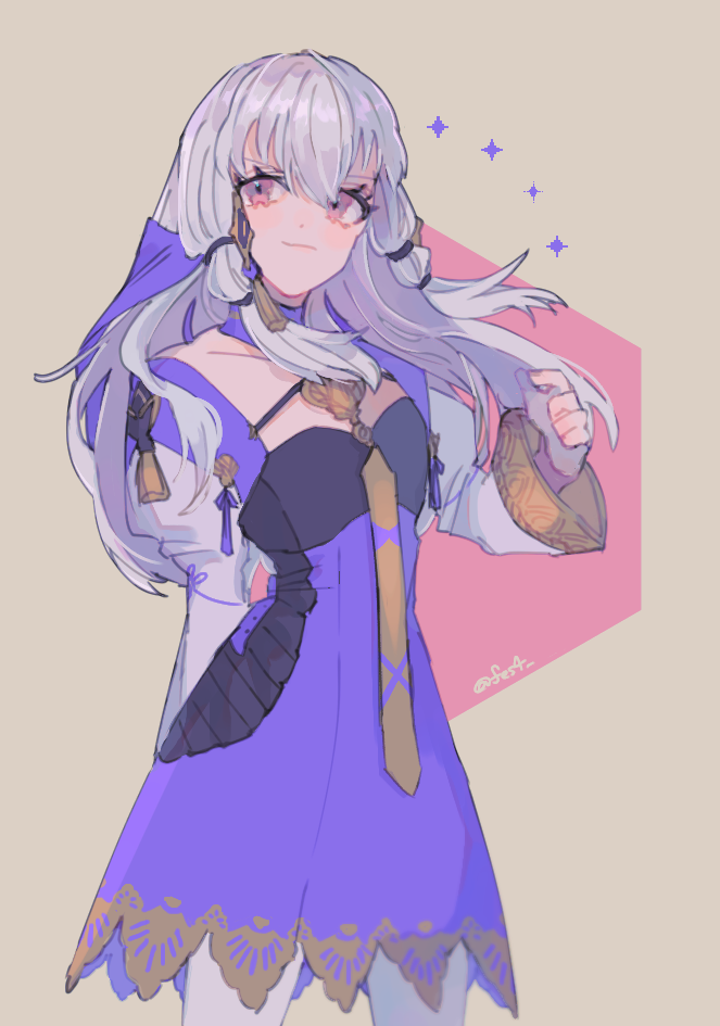 1girl choker closed_mouth collarbone cowboy_shot dress fes4 fire_emblem fire_emblem:_three_houses flat_chest floating_hair grey_background hair_between_eyes long_hair long_sleeves lysithea_von_ordelia lysithea_von_ordelia_(timeskip) nintendo pantyhose pink_eyes purple_choker purple_dress shrug_(clothing) solo standing white_hair