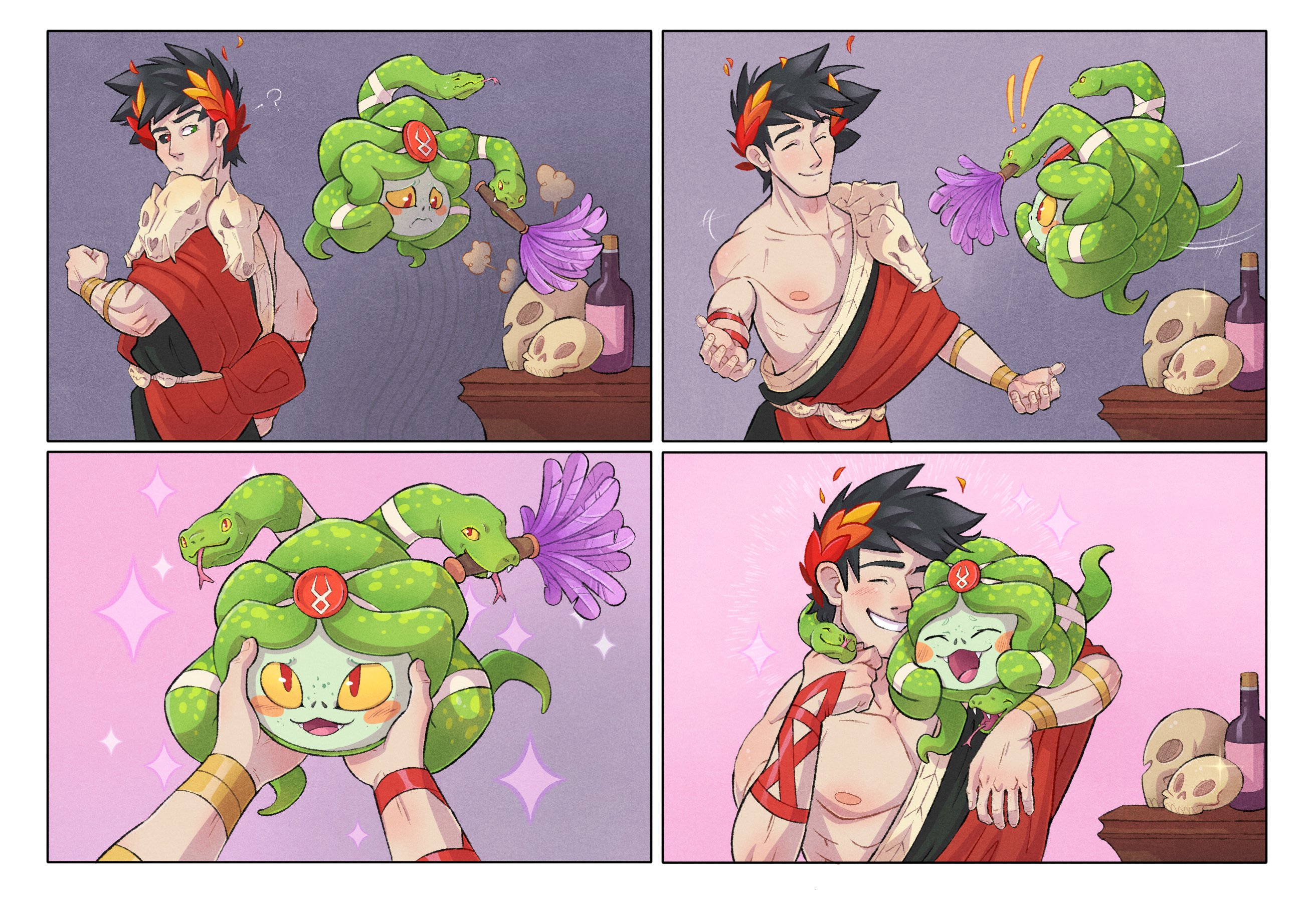 1boy 1girl ^_^ ancient_greek_clothes black_hair black_sclera blush_stickers closed_eyes colored_sclera colored_skin dusa_(hades) duster fangs feather_duster greco-roman_clothes green_eyes green_skin hades_(series) hades_1 heterochromia highres hug jamie_loughran laurel_crown mismatched_sclera open_mouth red_eyes single_bare_shoulder skull smile snake_hair sparkle yellow_sclera zagreus_(hades)