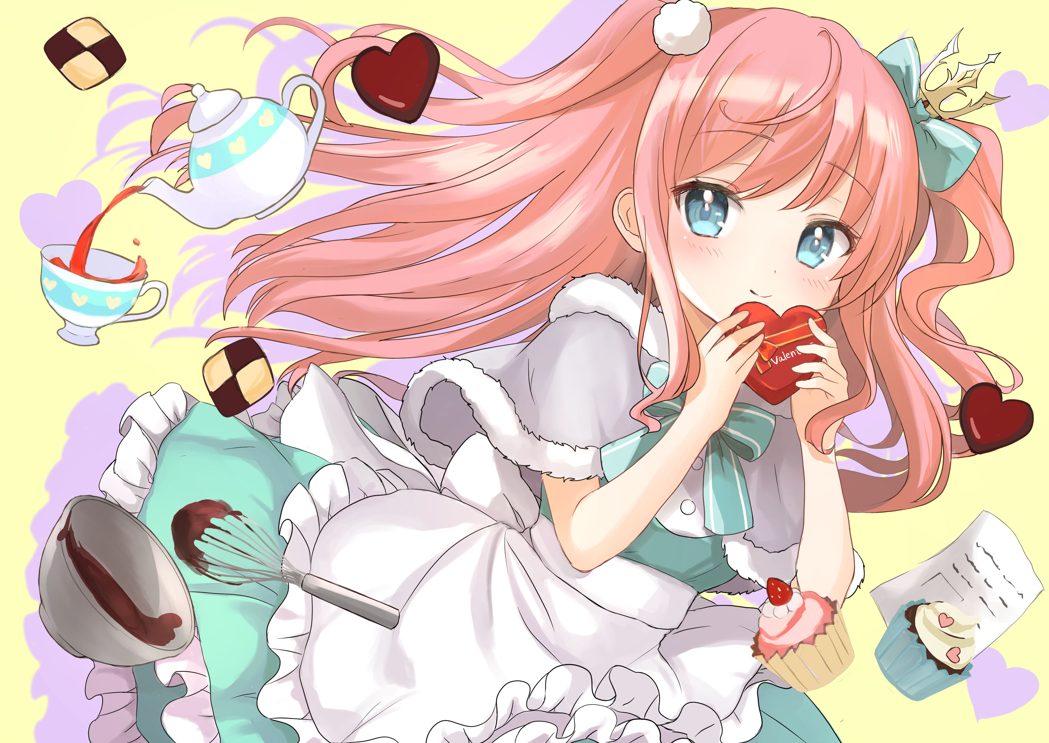 1girl absurdres apron blue_eyes blush bow bowl box boxcutter candy capelet checkerboard_cookie chocolate chocolate_heart cookie crown cup cupcake dress food frilled_dress frills fur-trimmed_capelet fur_trim hair_bow hair_ornament heart heart-shaped_box highres holding holding_boxcutter long_hair looking_at_viewer mini_crown original paper pink_hair pom_pom_(clothes) pom_pom_hair_ornament pouring recipe_(object) ribbon smile solo tea teacup teapot two_side_up valentine waist_apron whisk yaminabe_(szhal14)