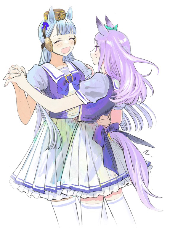 2girls ^_^ animal_ears arm_around_another's_waist blush closed_eyes dancing gold_ship_(umamusume) grey_hair holding_hands horse_ears horse_girl horse_tail long_hair looking_at_another mejiro_mcqueen_(umamusume) multiple_girls open_mouth purple_hair purple_shirt rosette_(roze-ko) sailor_collar shirt short_sleeves simple_background skirt smile tail thighhighs umamusume white_background white_skirt white_thighhighs