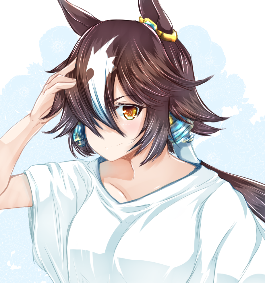 1girl animal_ears brown_hair closed_mouth hair_over_one_eye horse_ears horse_girl long_hair looking_at_viewer ponytail r0g0b0 shirt short_sleeves smile solo umamusume vodka_(umamusume) white_background white_shirt yellow_eyes