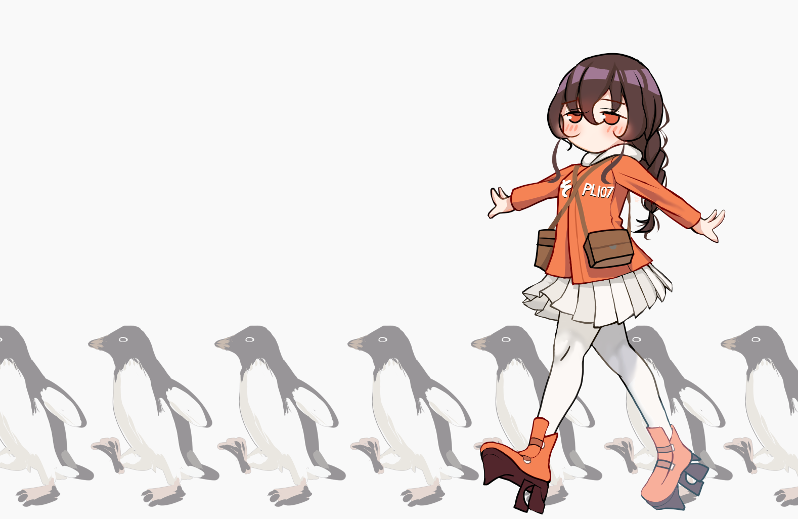 1girl bag bird braid brown_hair hood hood_down hooded_jacket jacket kantai_collection long_hair long_sleeves messenger_bag miniskirt nagisa_nagi orange_eyes orange_jacket orange_shoes pantyhose penguin pleated_skirt rudder_footwear shoes shoulder_bag single_braid skirt souya_(kancolle) souya_agb_(kancolle) walking white_hood white_pantyhose white_skirt