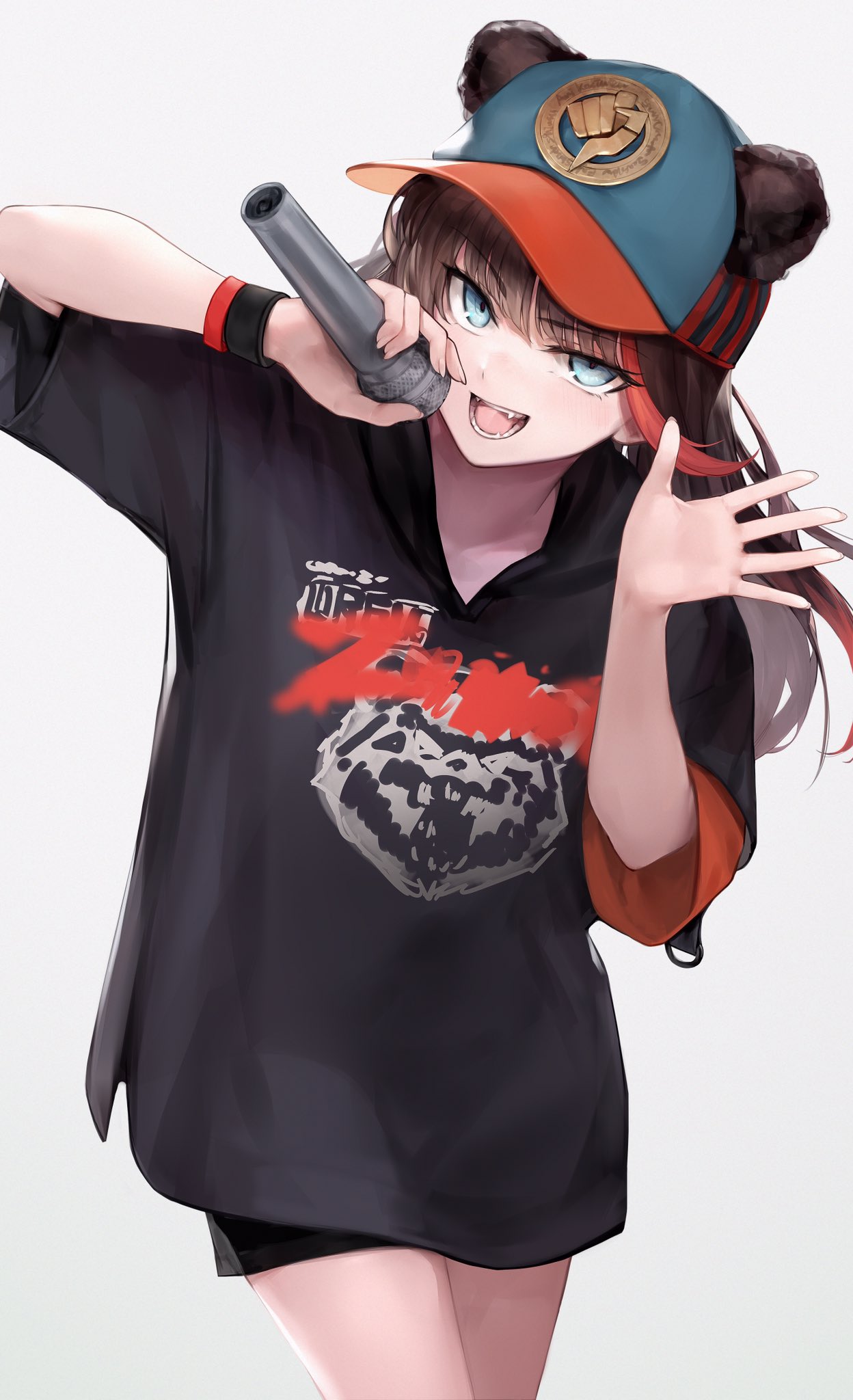 1girl :d animal_ears arknights baseball_cap bear_ears black_shirt blue_eyes brown_hair cowboy_shot ears_through_headwear hat highres holding holding_microphone ink. long_hair looking_at_viewer microphone multicolored_hair open_mouth red_hair shirt short_sleeves simple_background smile solo standing streaked_hair v-shaped_eyebrows white_background wristband zima_(arknights)