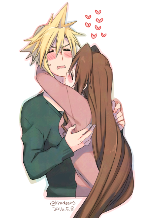 1boy 1girl 2016 aerith_gainsborough bad_id bad_pixiv_id blonde_hair blush brown_hair closed_eyes cloud_strife couple cropped_torso dated final_fantasy final_fantasy_vii green_sweater heart hetero hug krudears long_hair long_sleeves open_mouth pink_sweater spiked_hair straight_hair sweatdrop sweater twitter_username upper_body very_long_hair wavy_mouth white_background