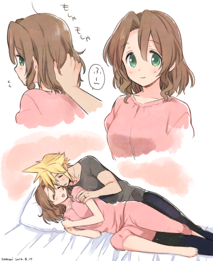 1boy 1girl 2016 :d aerith_gainsborough alternate_hair_length alternate_hairstyle bad_id bad_pixiv_id bed_sheet black_pants blonde_hair brown_hair closed_eyes closed_mouth cloud_strife couple cropped_torso dated final_fantasy final_fantasy_vii green_eyes grey_shirt hair_between_eyes hair_intakes hetero jewelry krudears lying medium_hair on_side open_mouth pajamas pants pendant pillow pink_pants pink_shirt shirt short_sleeves sketch smile speech_bubble straight_hair t-shirt