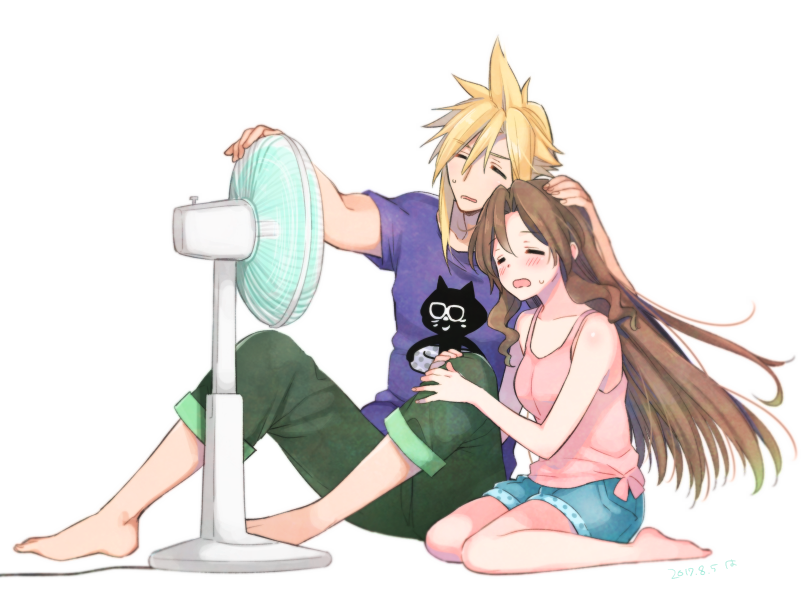 1boy 1girl aerith_gainsborough animal_print bad_id bad_pixiv_id bare_arms bare_legs barefoot blonde_hair blue_shorts blush brown_hair cat_print closed_eyes cloud_strife collarbone couple denim denim_shorts final_fantasy final_fantasy_vii floating_hair full_body green_pants hand_in_another's_hair hetero krudears long_hair open_mouth pants pink_shirt print_shirt purple_shirt shirt short_shorts short_sleeves shorts simple_background sitting sleeveless sleeveless_shirt spiked_hair straight_hair sweatdrop t-shirt very_long_hair wariza white_background