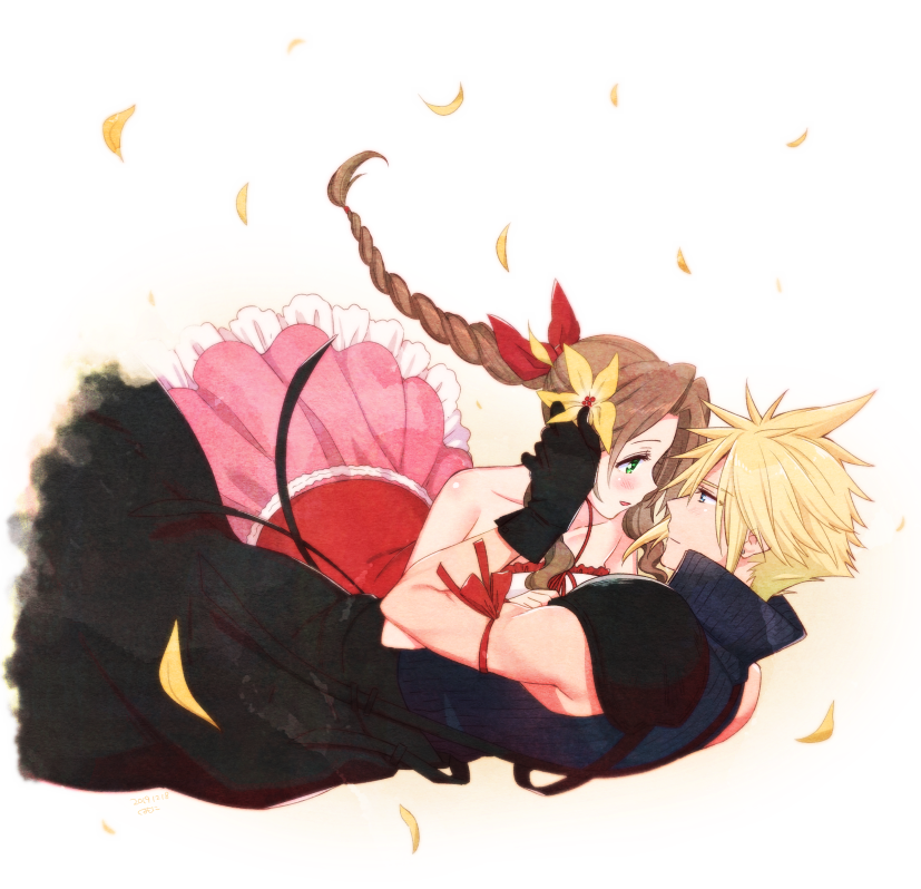 1boy 1girl aerith_gainsborough arm_ribbon bad_id bad_pixiv_id black_gloves black_skirt blonde_hair blue_eyes blue_sweater brown_hair cloud_strife collarbone couple eye_contact final_fantasy final_fantasy_vii floating_hair flower gloves green_eyes hair_flower hair_ornament hair_tubes hetero kingdom_hearts krudears layered_skirt long_hair looking_at_another open_mouth pink_skirt red_ribbon red_shirt ribbed_sweater ribbon shirt skirt sleeveless sleeveless_shirt sleeveless_sweater spiked_hair square_enix sweater turtleneck turtleneck_sweater very_long_hair white_background yellow_flower