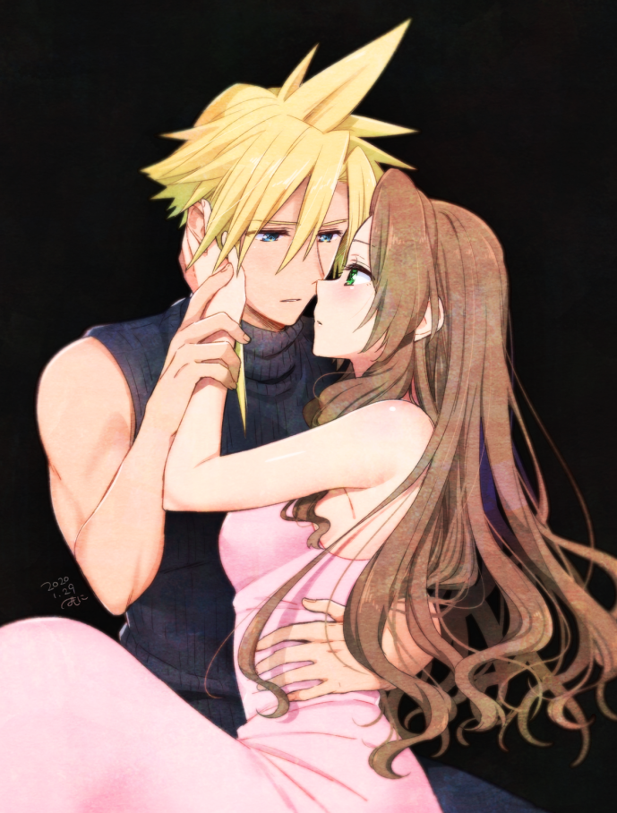 2020 aerith_gainsborough arm_around_another's_waist bad_id bad_pixiv_id bare_arms black_background black_sweater blonde_hair blue_eyes breasts brown_hair closed_mouth cloud_strife couple dated dress eye_contact final_fantasy final_fantasy_vii green_eyes hair_down hetero imminent_kiss krudears long_hair looking_at_another medium_breasts parted_lips pink_dress ribbed_sweater shiny_skin sleeveless sleeveless_dress sleeveless_sweater spiked_hair sweater very_long_hair