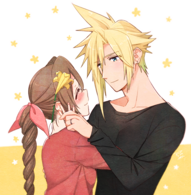 1boy 1girl aerith_gainsborough bad_id bad_pixiv_id black_shirt blonde_hair blue_eyes blush bow brown_hair closed_eyes closed_mouth cloud_strife collarbone couple drill_hair drill_ponytail final_fantasy final_fantasy_vii flower hair_bow hair_flower hair_ornament hetero jewelry krudears long_hair long_sleeves looking_at_another pink_bow red_shirt ring shirt smile spiked_hair square_enix upper_body white_background yellow_flower