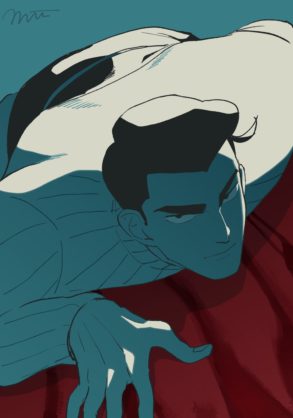1boy aqua_background bad_id bad_pixiv_id black_hair closed_mouth commentary crawling highres long_sleeves looking_at_viewer lying male_focus mii_anappleac on_stomach ouken ousama_ranking short_hair simple_background solo