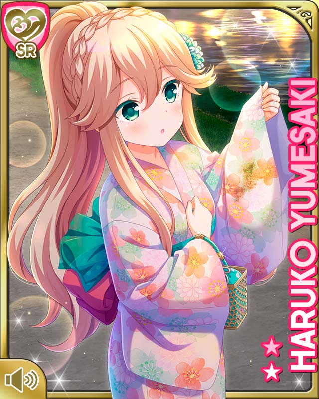 1girl :o basket blonde_hair bow card_(medium) character_name female_focus girlfriend_(kari) green_bow green_eyes japanese_clothes kimono long_hair looking_at_viewer night official_art open_mouth outdoors pink_kimono qp:flapper sash socks solo standing tagme yukata yumesaki_haruko