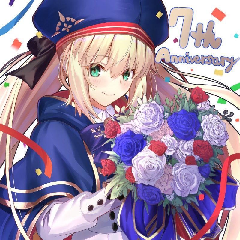 1girl artoria_caster_(fate) artoria_caster_(second_ascension)_(fate) artoria_pendragon_(fate) beret black_bow blonde_hair blue_cape blue_flower blue_ribbon blue_rose blush bow buttons cape cloak closed_mouth collar collared_shirt fate/grand_order fate_(series) flower gold_trim green_eyes hair_between_eyes hair_bow hat holding looking_at_viewer multicolored_cape neko_daruma ornament purple_bow red_ribbon ribbon rose shirt skirt smile twintails white_background white_flower white_rose white_shirt white_skirt