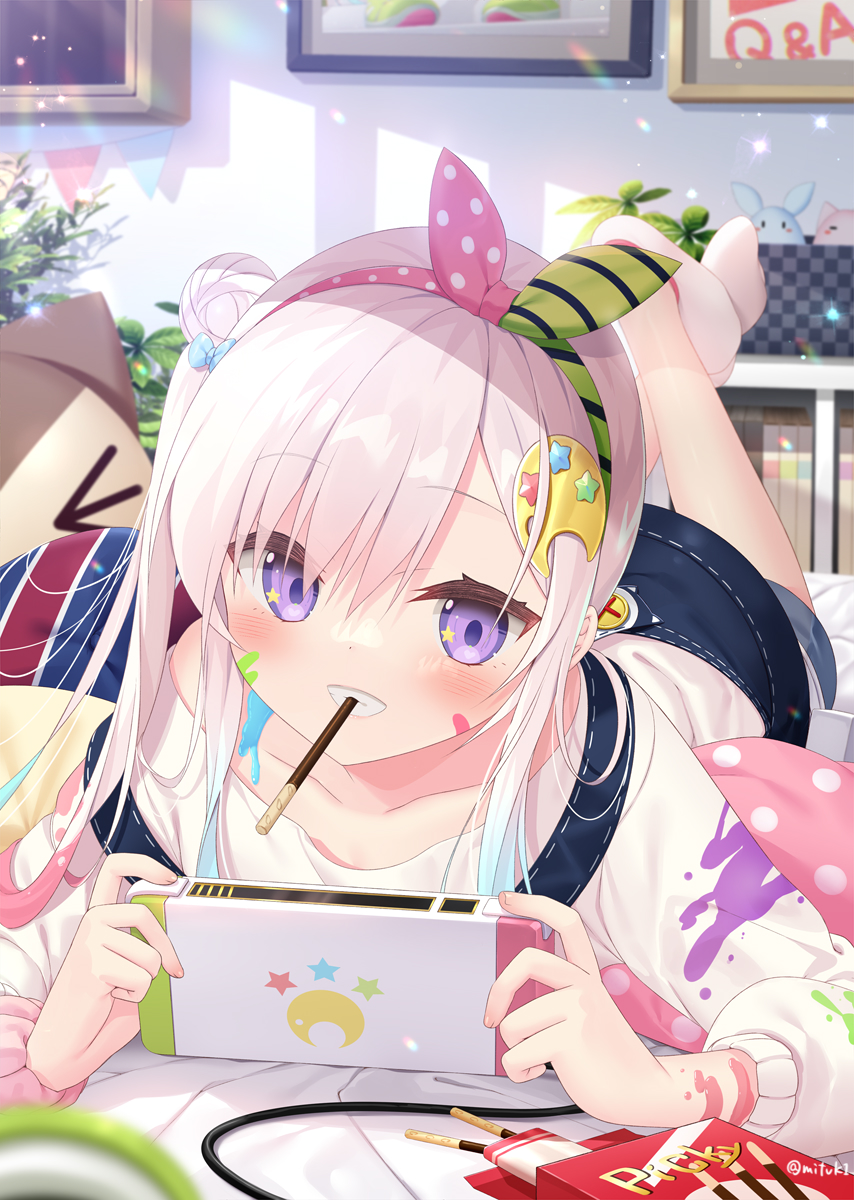 1girl airani_iofifteen airani_iofifteen_(1st_costume) artist_name bed blue_hair blurry blurry_foreground blush bookshelf collarbone commentary day eating feet_up food gradient_hair grin hair_ornament hairband handheld_game_console highres holding holding_handheld_game_console hololive hololive_indonesia indoors lens_flare long_hair long_sleeves looking_at_viewer lying mouth_hold multicolored_hair on_stomach overalls paint_splatter painting_(object) pink_hair plant playing_games playing_video_games pocky purple_eyes shirt side_ponytail signature smile socks solo star_(symbol) star_in_eye stuffed_animal stuffed_toy sunlight symbol_in_eye teeth_hold twitter_username virtual_youtuber white_shirt white_socks yano_mitsuki_(nanairo)