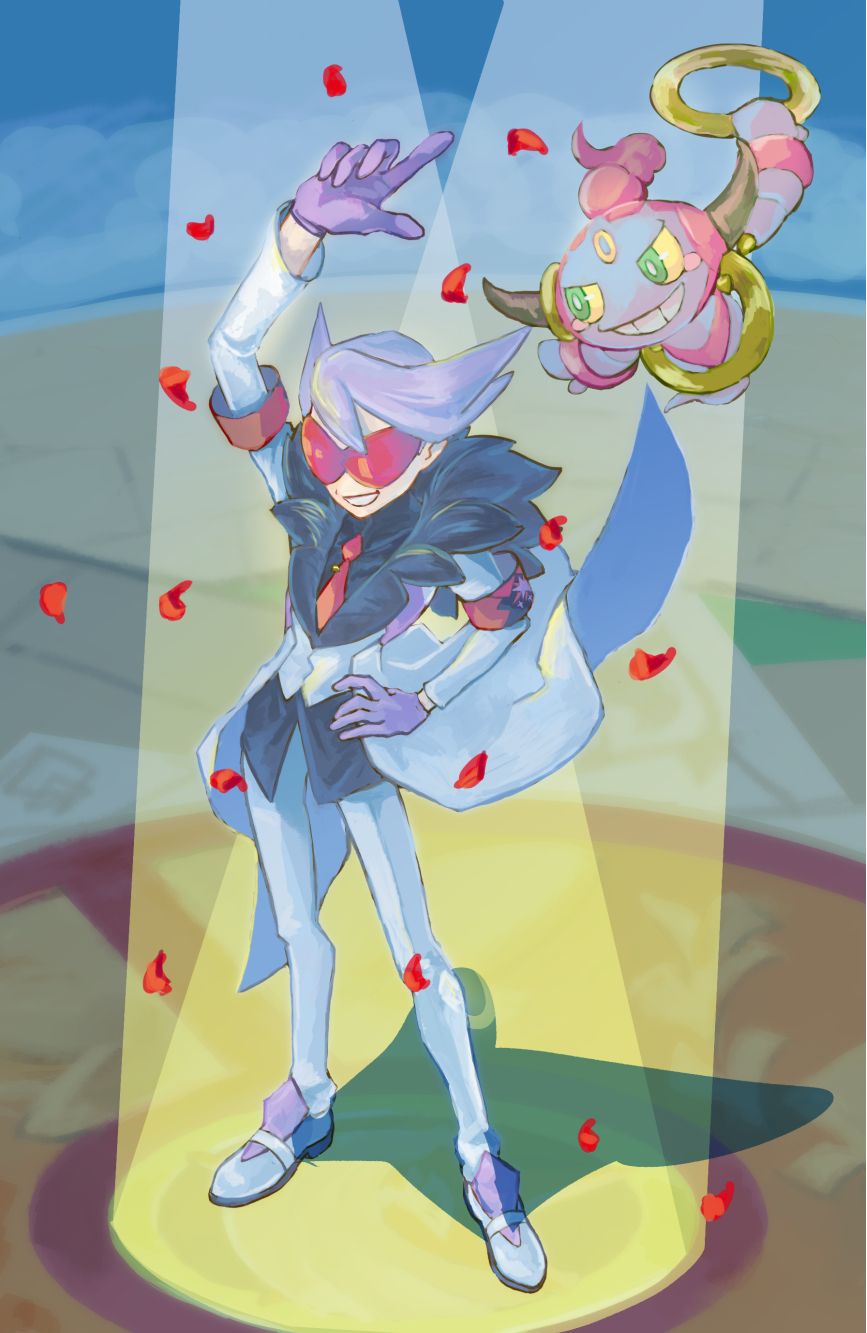 1boy amajilu arm_up armband black_shirt coat commentary_request fur-trimmed_coat fur_trim gen_6_pokemon gloves hand_on_own_hip highres hoopa hoopa_(confined) lear_(pokemon) legendary_pokemon long_sleeves male_focus mythical_pokemon necktie nintendo pants petals pokemon pokemon_(creature) pokemon_masters_ex purple_gloves purple_hair red-tinted_eyewear red_necktie shirt shoes smile spotlight standing sunglasses tinted_eyewear white_coat white_footwear white_pants