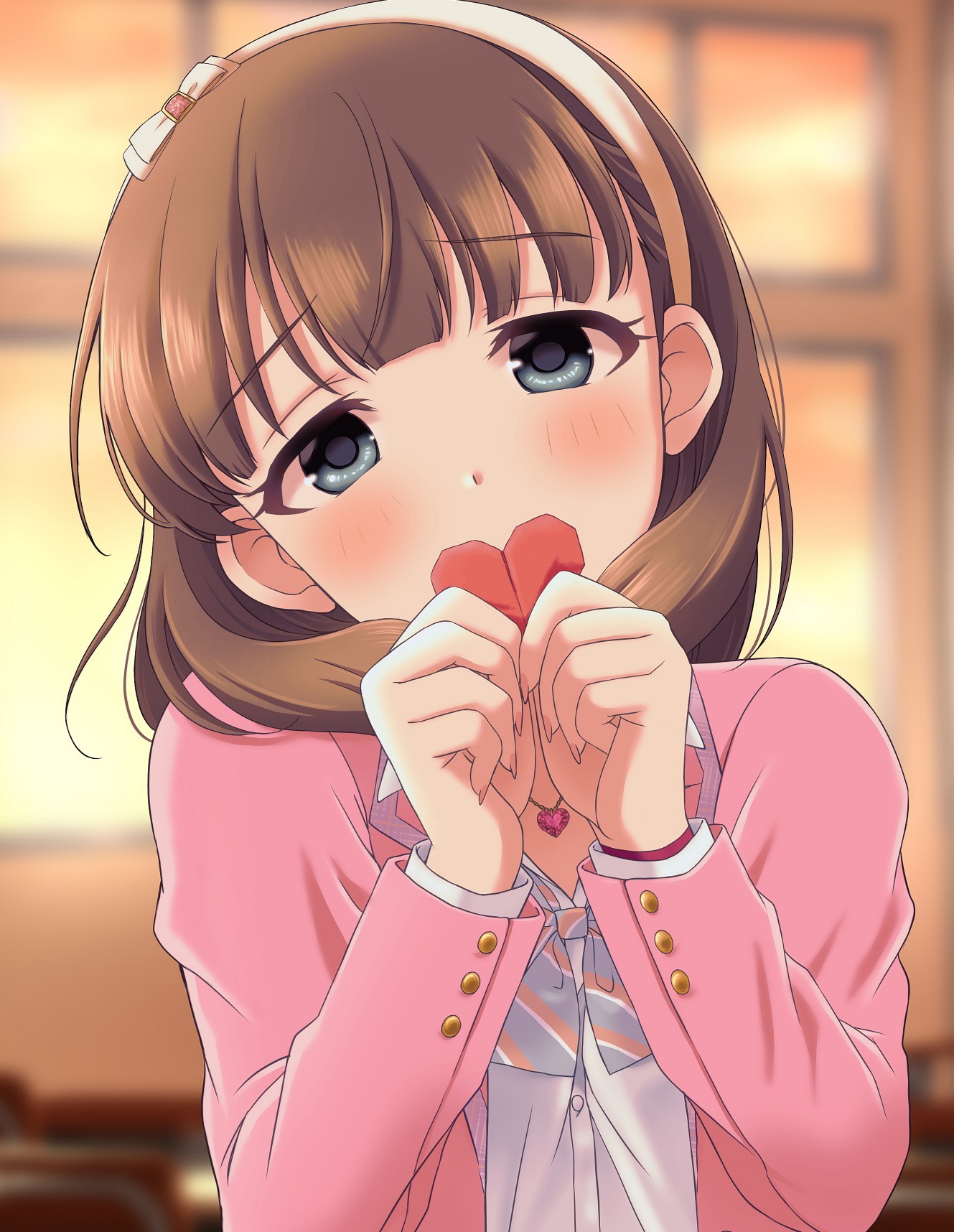 1girl annyuiusagi blazer blunt_bangs blurry blurry_background blush bow bowtie brown_hair classroom covered_mouth gem head_tilt heart highres holding holding_paper idolmaster idolmaster_cinderella_girls indoors jacket looking_at_viewer paper pink_jacket sakuma_mayu solo striped_bow striped_bowtie striped_clothes sunset upper_body