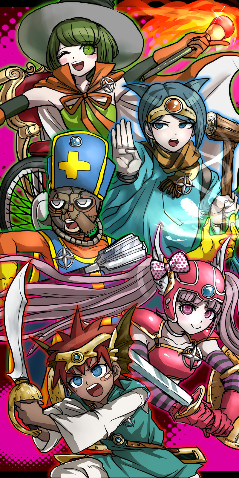 2girls 3boys alternate_costume arm_warmers armor bandaid bandaid_on_face blue_eyes blue_hair blush boobplate bow breastplate brown_headwear brown_scarf cape child closed_mouth clothing_request collarbone daimon_masaru_(danganronpa) danganronpa_(series) danganronpa_another_episode:_ultra_despair_girls dark_skin dress gloves green_dress green_eyes green_hair green_tunic grey_eyes hat helmet highres holding holding_mace holding_staff holding_sword holding_weapon kemuri_jataro long_hair long_sleeves mace mask medium_hair messy_hair multiple_boys multiple_girls official_style one_eye_closed open_mouth orange_cape orange_sleeves outstretched_arms pants pink_eyes pink_gloves pink_hair polka_dot polka_dot_bow red_chair red_hair scarf shingetsu_nagisa short_hair shoulder_armor staff staff_(weapon) striped_arm_warmers striped_clothes striped_gloves sword tagme tan teeth tongue towa_monaca tunic twintails upper_teeth_only utsugi_kotoko viking_helmet weapon wheel wheelchair white_pants white_sleeves winged_helmet wink witch_hat wooden_staff yellow_scarf