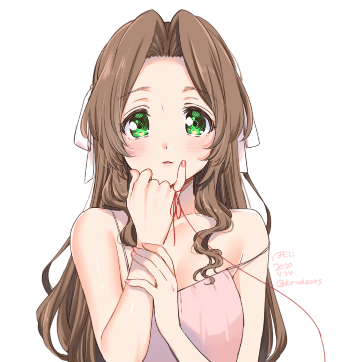 1girl aerith_gainsborough bad_id bad_pixiv_id bare_arms brown_hair collarbone final_fantasy final_fantasy_vii green_eyes hair_intakes hair_ribbon krudears long_hair looking_at_viewer nail_polish pink_nails red_ribbon ribbon shiny_skin shirt simple_background sleeveless sleeveless_shirt solo spaghetti_strap strap_slip twitter_username upper_body very_long_hair white_background white_ribbon white_shirt