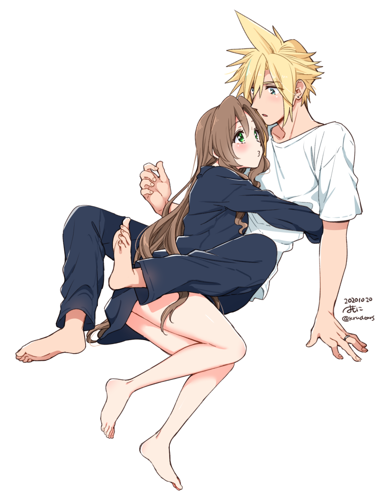 1boy 1girl 2020 aerith_gainsborough bad_id bad_pixiv_id bare_legs barefoot black_pants black_shirt blonde_hair blue_eyes blush brown_hair cloud_strife couple dated eye_contact final_fantasy final_fantasy_vii green_eyes hetero hug jewelry krudears long_hair long_sleeves looking_at_another naked_shirt pants ring shirt simple_background spiked_hair square_enix straight_hair t-shirt twitter_username very_long_hair wedding_ring white_background white_shirt