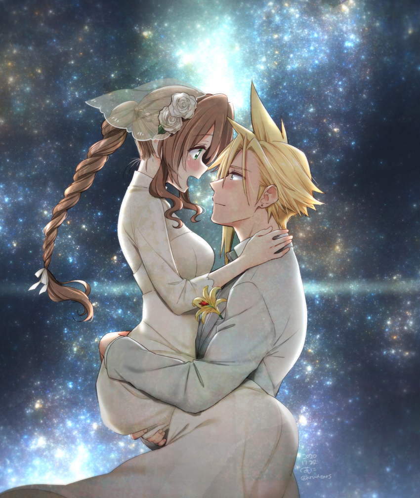 1boy 1girl :d aerith_gainsborough bad_id bad_pixiv_id blonde_hair blue_eyes braid braided_ponytail bridal_veil brown_hair carrying closed_mouth cloud_strife couple dress eye_contact final_fantasy final_fantasy_airborne_brigade final_fantasy_vii floating_hair flower from_side green_eyes grey_vest hair_between_eyes hair_flower hair_ornament hair_ribbon hetero husband_and_wife jacket krudears long_dress long_hair long_sleeves looking_at_another official_alternate_costume open_mouth ponytail ribbon rose sky smile spiked_hair square_enix star_(sky) starry_sky veil very_long_hair vest wedding_dress white_dress white_flower white_jacket white_ribbon white_rose yellow_flower