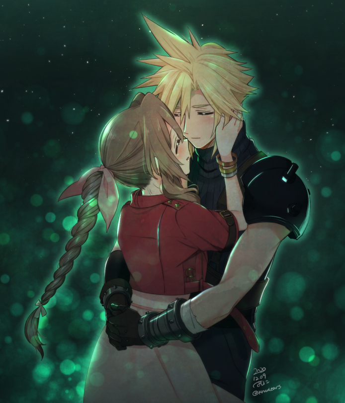 1boy 1girl 2020 aerith_gainsborough armor bad_id bad_pixiv_id black_gloves black_sweater blonde_hair bow bracelet braid braided_ponytail brown_hair closed_eyes closed_mouth cloud_strife couple dated dress final_fantasy final_fantasy_vii floating_hair gloves hair_bow hair_intakes hetero hug jewelry krudears lens_flare long_hair open_mouth pink_bow pink_dress ponytail ribbed_sweater shoulder_armor sleeveless sleeveless_sweater spiked_hair square_enix sweater twitter_username