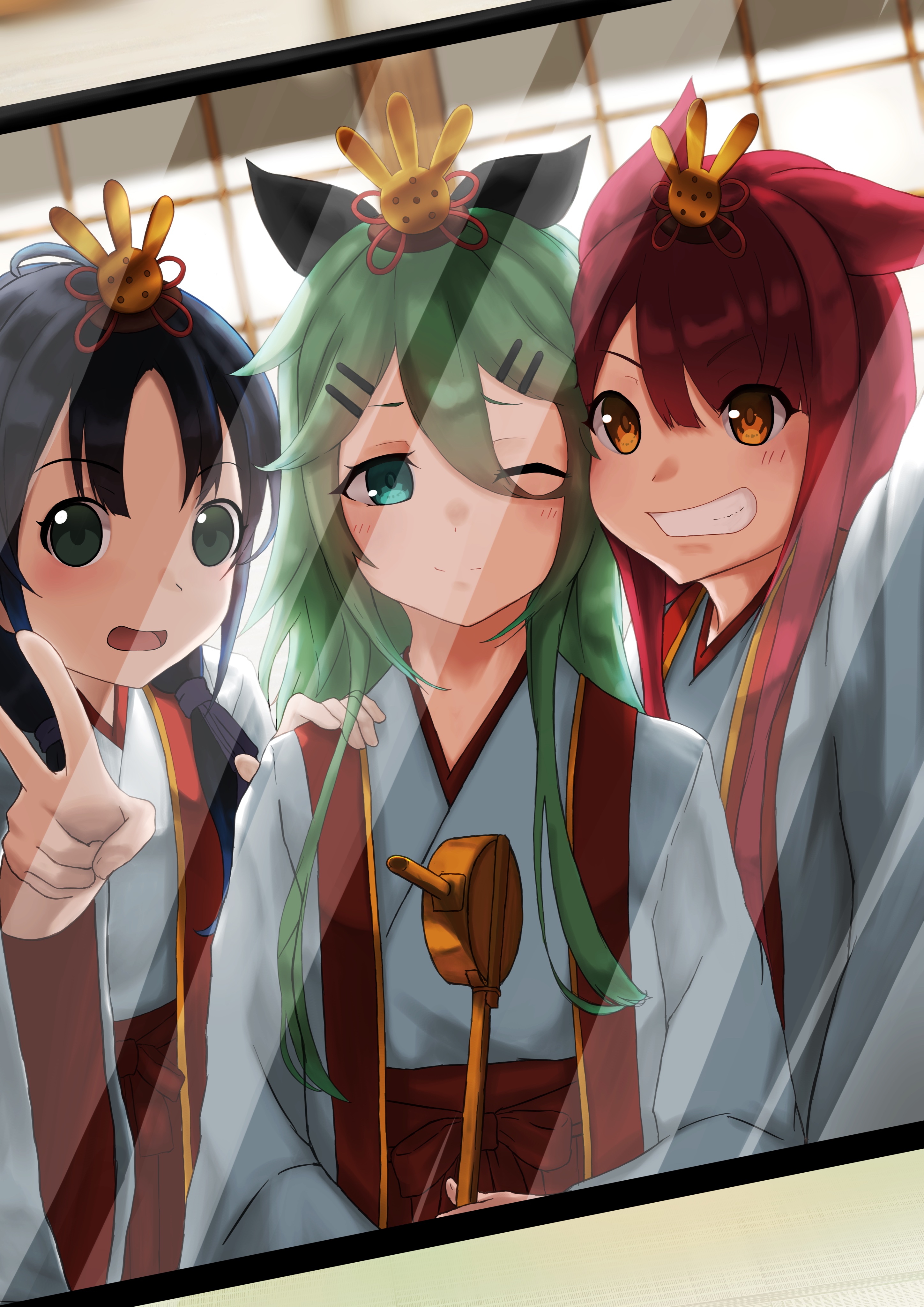 3girls absurdres black_eyes black_hair black_ribbon chihaya_(clothing) fake_screenshot green_eyes green_hair grin hair_flaps hair_ornament hair_ribbon hairclip highres igarashi_(whale_shark_sig) japanese_clothes kantai_collection kawakaze_(kancolle) kawakaze_kai_ni_(kancolle) long_hair matching_outfits miko multiple_girls one_eye_closed red_hair ribbon selfie smile suzukaze_(kancolle) upper_body v yamakaze_(kancolle) yamakaze_(miko)_(kancolle) yellow_eyes